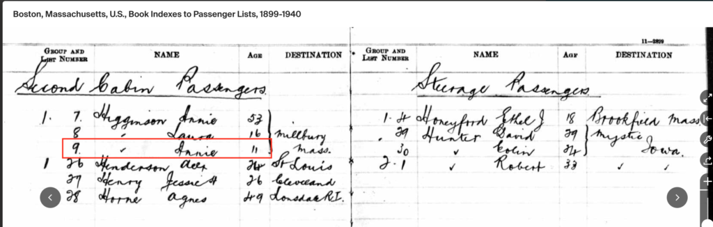 I thought she came over from Ireland in 1918.  It was 1911.  She was 11, and came over with her mother and sister, on the “Scotian“.